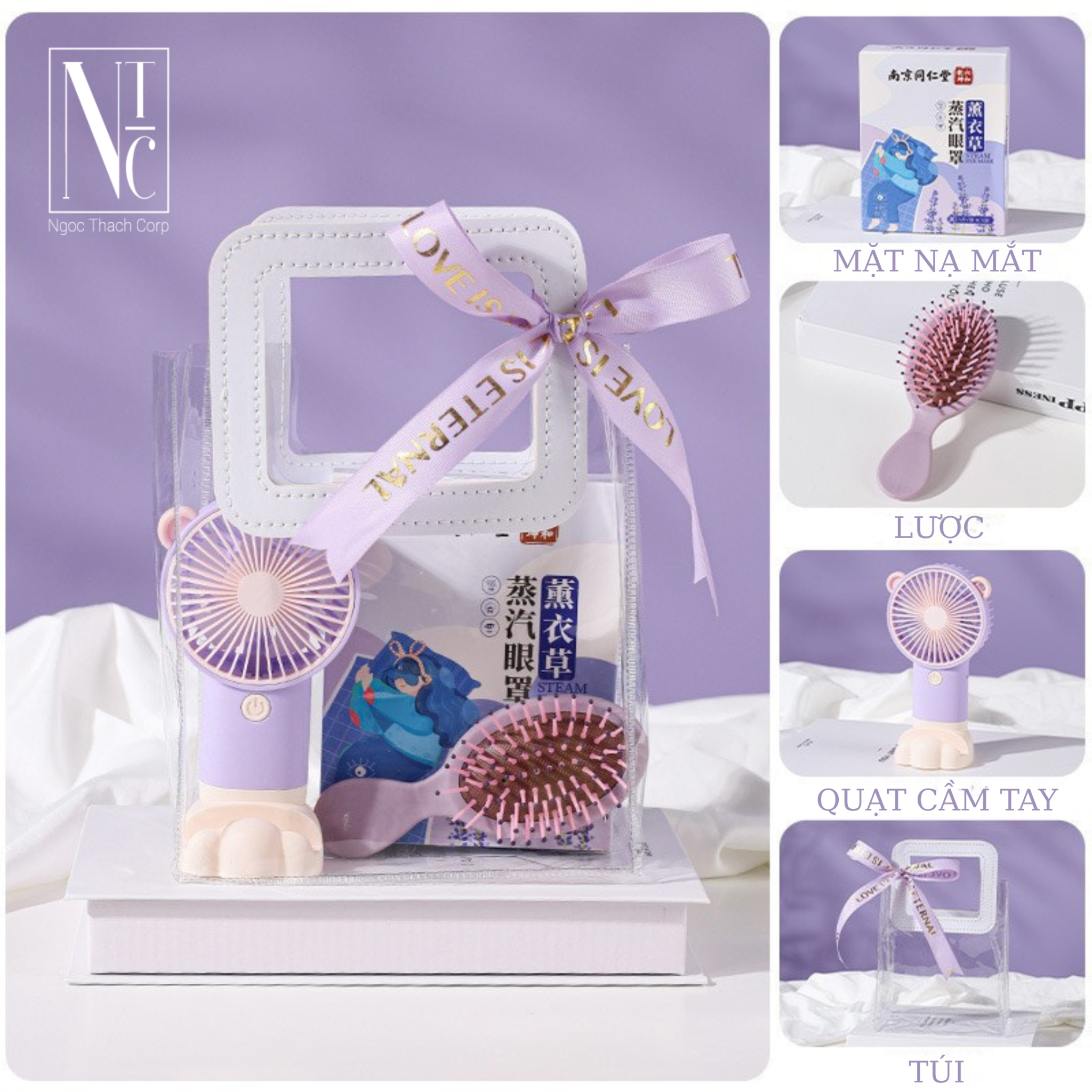 4. Set Spa Mini: Mặt Nạ Mắt thư giãn, Lược, Mỹ Phẩm, Túi xách - Dành cho cô nàng thích chăm sóc bản thân với các vật dụng làm đẹp cơ bản.