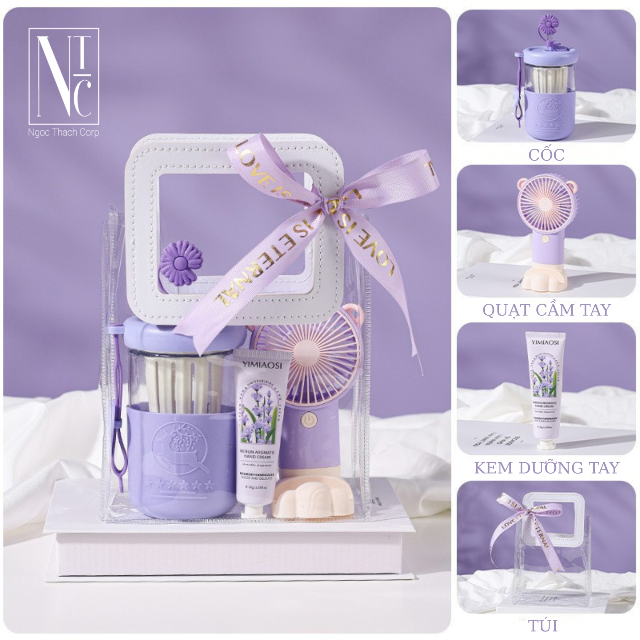 5. Set Chăm Sóc Toàn Diện: Cốc bọc silicon, Quạt Cầm Tay, Kem Dưỡng Tay, Túi xách - Sự kết hợp giữa tiện ích cá nhân và chăm sóc da cơ bản, món quà rất tinh tế và chu đáo.