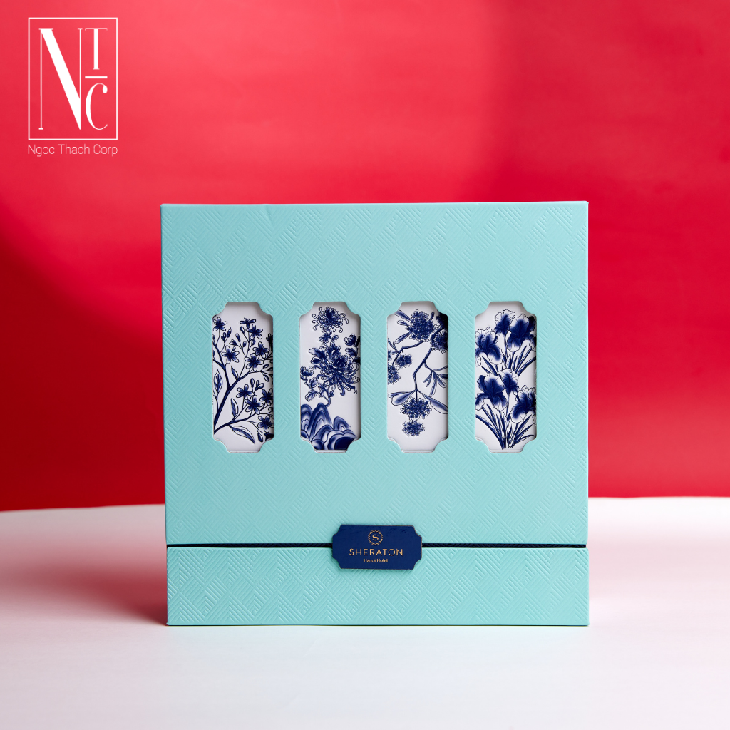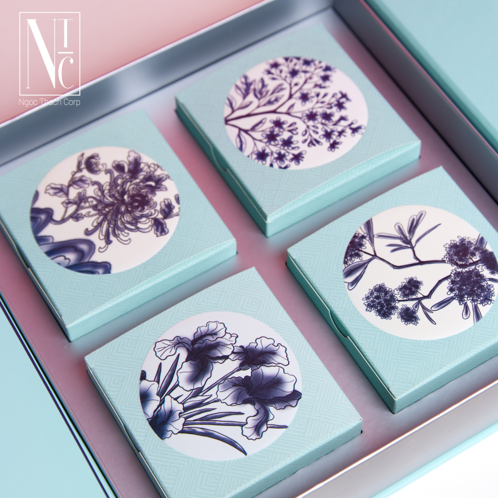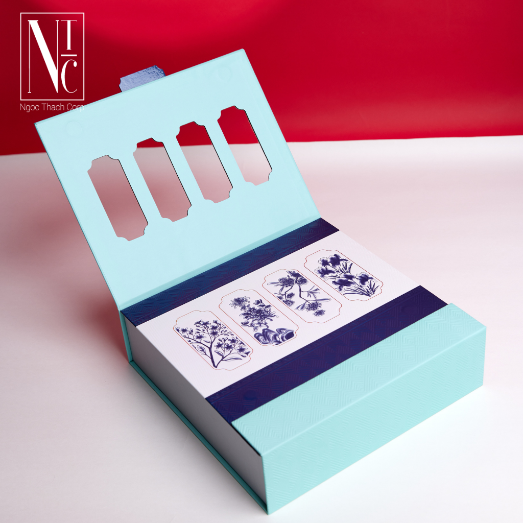 Hộp được lấy cảm hứng từ men lam truyền thống – sắc xanh dịu nhẹ, trong trẻo, tạo cảm giác thanh tịnh và sang trọng.
