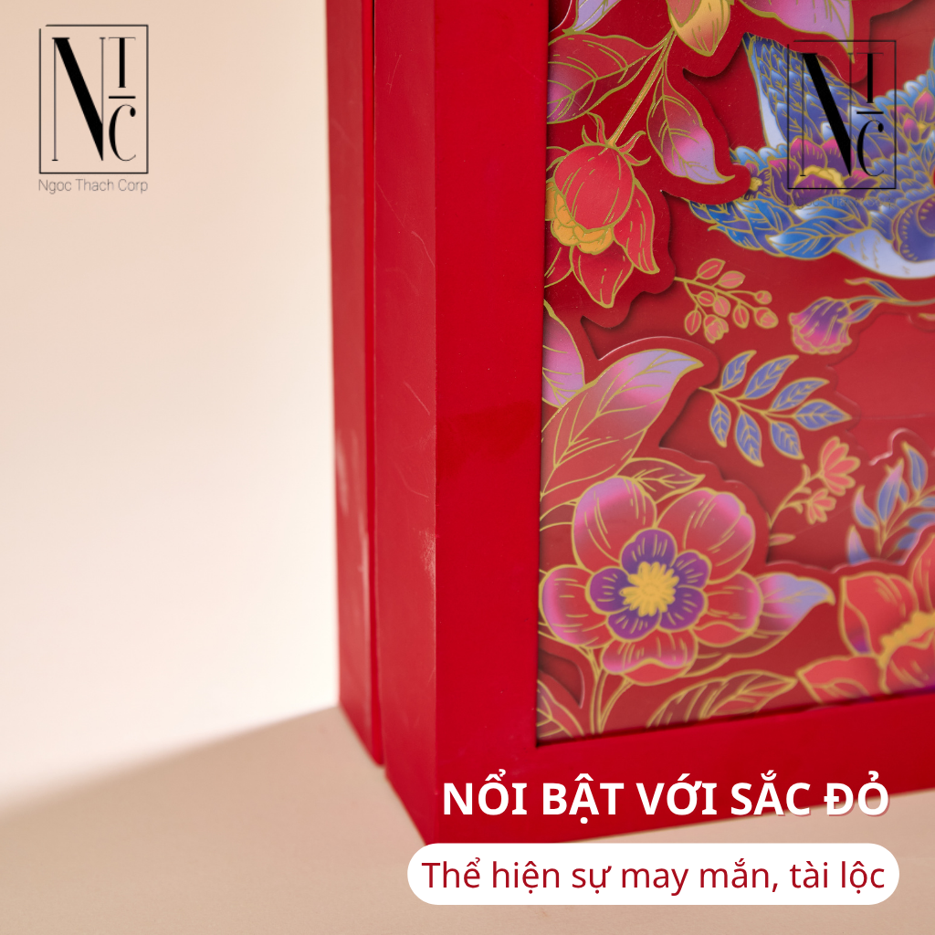 Tông đỏ chủ đạo tượng trưng cho may mắn – tài lộc – sum vầy, rất phù hợp làm quà tặng đối tác, khách hàng, nhân viên vào dịp Trung Thu và Tết Nguyên Đán.
